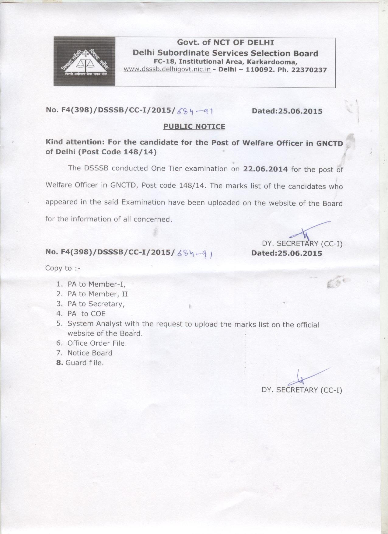 - DownloadPUBLIC NOTICE:KIND ATTENTION CANDIDATES FOR POST OF WELFARE OFFICER IN GNCTD OF DELHI(POST CODE 148/14)Date: 19-09-2022 | 210.86 किलोबाइट