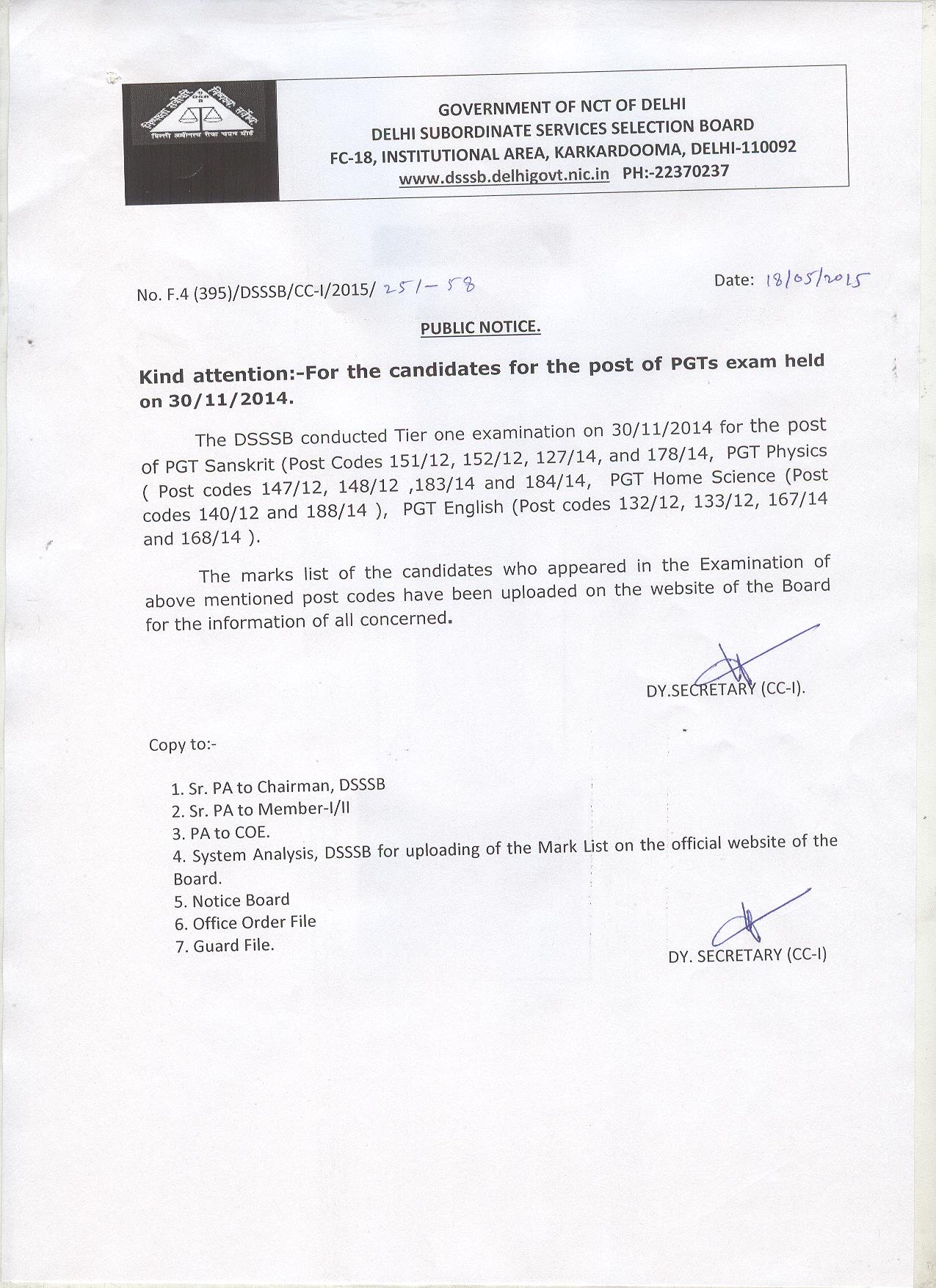 - PUBLIC NOTICE: KIND ATTENTION FOR THE CANDIDATES FOR THE POST OF PGTs EXAM HELD ON 30/11/2014.Date: 19-09-2022 | 299.68 KB